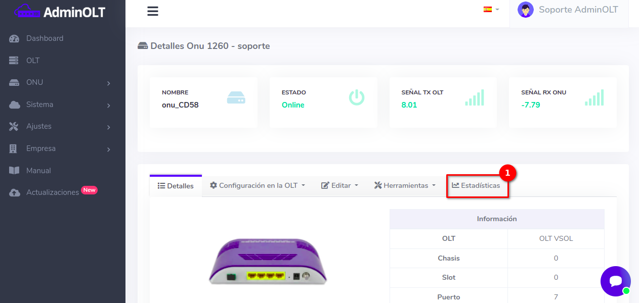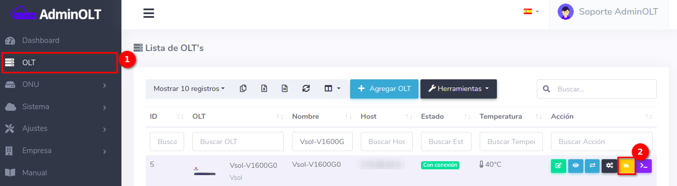 Ahora el sistema de AdminOLT ha habilitado que las marcas de OLT VSOL y WOLCK puedan activar el monitoreo. Con esto se podrán mostrar las gráficas de consumo y estado tanto de la OLT y de la ONU.