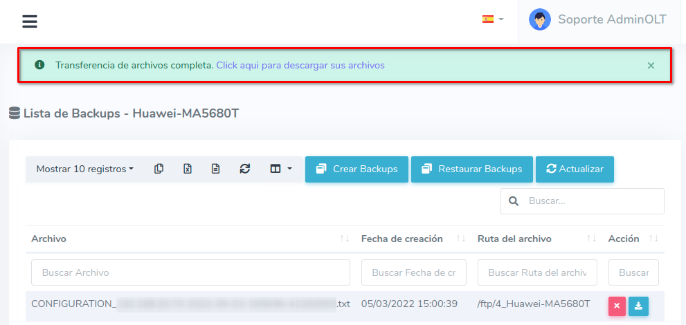Ahora es posible descargar los backups (respaldos) listados en la tabla que está disponible en AdminOLT. Esta opción es única para OLTs marca HUAWEI y ZTE