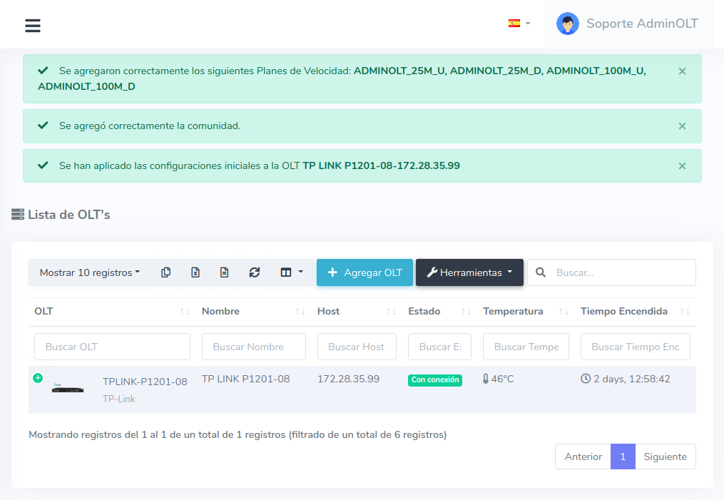 Después de aplicar las configuraciones iniciales, puede demorar entre 10-20 minutos en verse reflejados en su OLT.