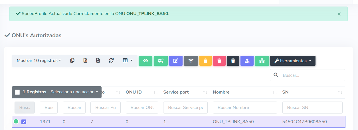 Para este ejemplo usaremos una ONU Autorizada que inicialmente tiene un Plan de 100 Megas, en este caso nosotros lo cambiaremos a un Plan de 25 Megas.