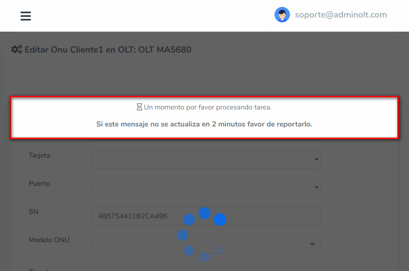 7 Esperamos que AdminOLT se conecte con su OLT y haga los cambios.