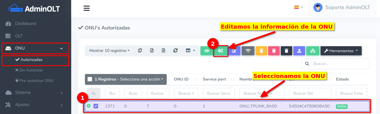 Dar click en el texto Editar en OLT que se encuentra en el botón con la leyenda Editar.