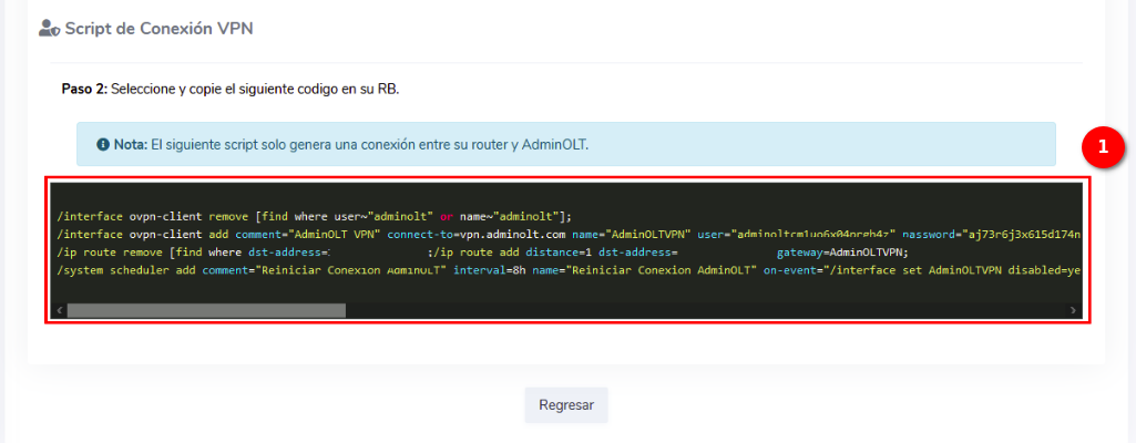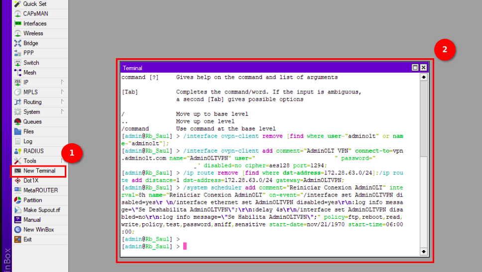 4En la terminal de su Routerboard pegamos el script generado por AdminOLT y verificamos la conexión.