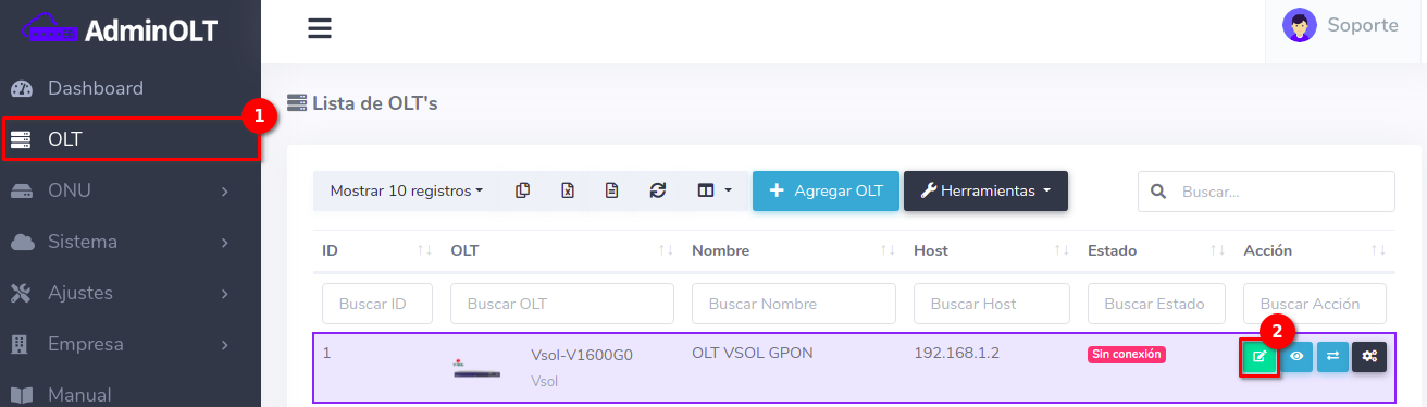 1En la Lista de OLT's seleccionamos el equipo que deseamos conectar. La OLT ya debe estar registrada en AdminOLT.