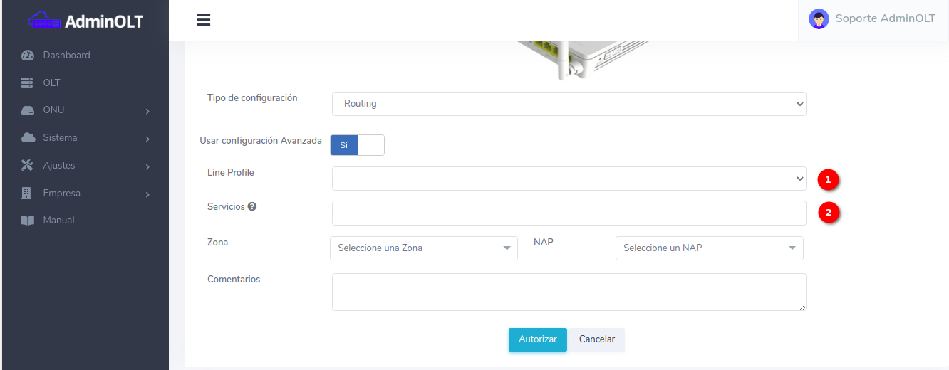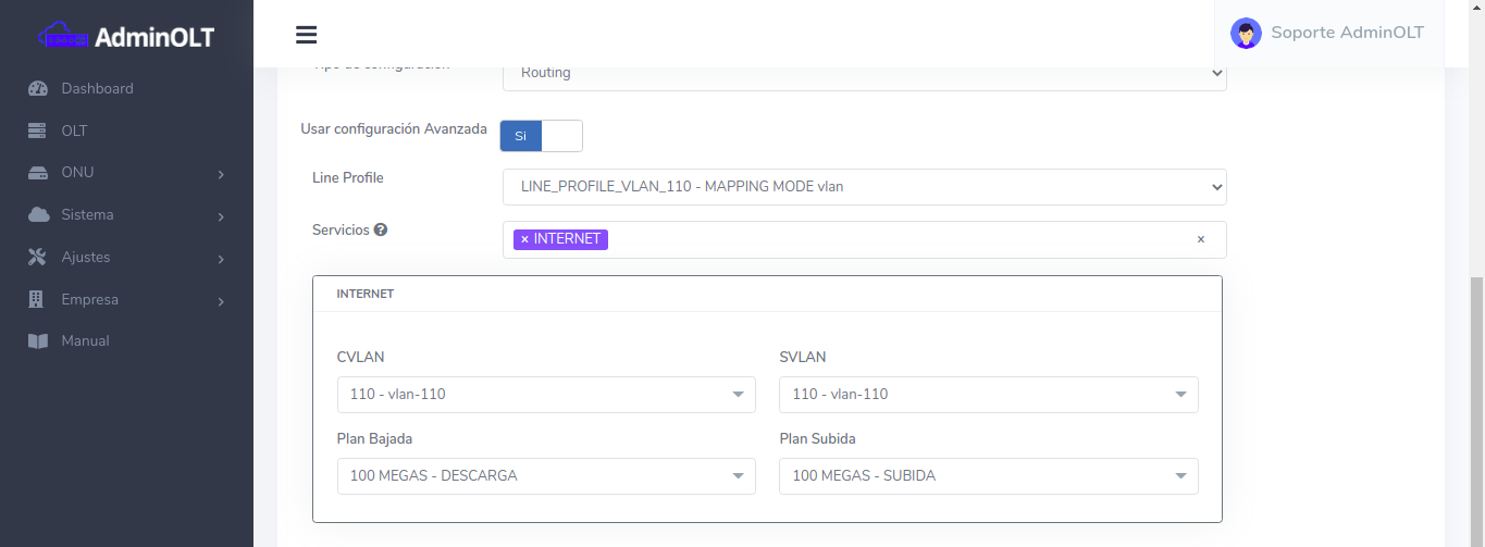- Line Profile: encontrara una lista de Line Profiles creados en AdminOLT pertenecientes a la OLT seleccionada. Adicional una opción "Crear perfil generico" que permite crear una configuración perzonalizada Line Profile, de acuerdo a los servicios y CVLAN's seleccionados.