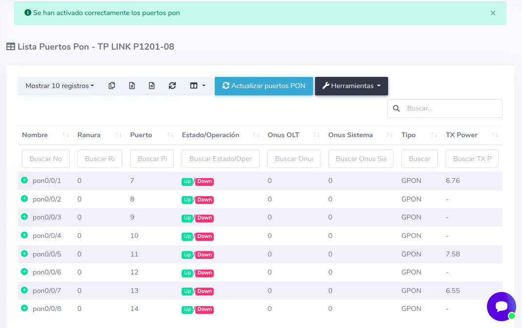 3 Una vez que se termine el proceso podremos ver en la vista la lista de puertos disponibles en nuestra OLT.