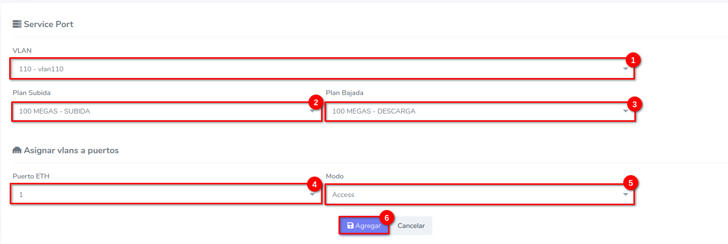 4 Seleccione una VLAN de las vlan's asignadas en la OLT, un plan de subida, de bajada, el puerto a donde ira dirigida esa vlan y en que modo.