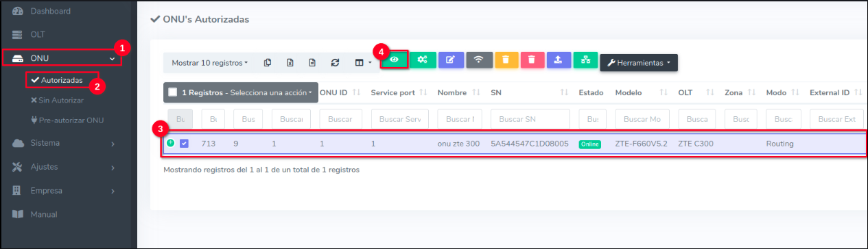 1Dirijase a la sección de ONU > Autorizadas > Editar Plan de Velocidad