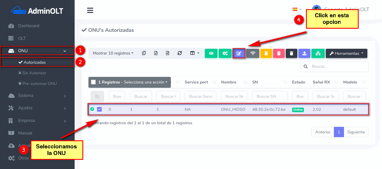 Pasos para editar información de ONU Autorizada en AdminOLT