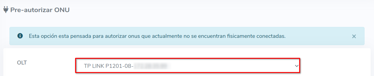 Es necesario que como primer paso sea seleccionar la OLT donde se realizara la acción. Al momento de seleccionar alguna OLT, se autocompletarán algunos datos del formulario, por ejemplo Tarjetas, Puertos o VLAN.